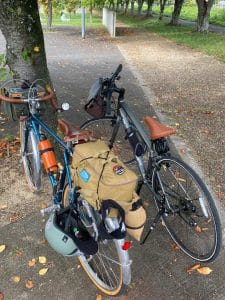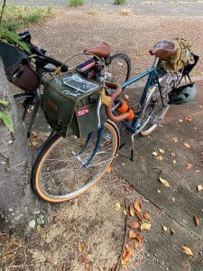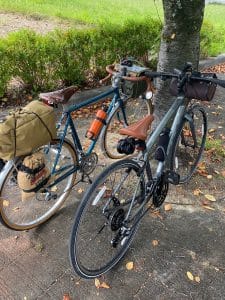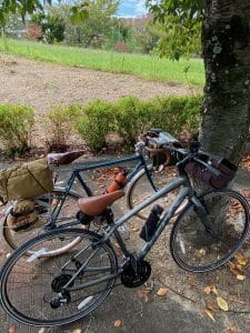 ようやく、あの40℃越えの日々が過ぎ去り、朝晩が涼しくなってきた今日この頃です。涼しくなればこっちのもんです(笑) 嫌がる鬼嫁の苦しい言い訳(午前中にテニスのレッスン参加で運動をしたと主張)には一切耳を貸さず、隣町まで自転車で繰り出すぞ!と、部屋で待機している2台の自転車の整備(タイヤの空気入れ、乾ききったチェーンやギヤの油さし)を俊敏な動きで対処。そして飲み物の補充、おやつ、コーヒーセットを用意しますが、一つ用意しては、あれも要るなあ、あっ!あれもやあと夜逃げ同然の荷物みたいに変貌!一括で準備出来ない情けない中高年でございます。結局、行くぞと言いながらも30分は経過している有様です。今回は往復30キロ前後の距離ですが、本当に久しぶりの自転車で体力が、、、、そんな自転車を見てやって下さい。